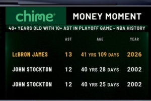 轉(zhuǎn)播方曬出統(tǒng)計,詹姆斯今日13次助攻刷新了歷史上40歲球員季后賽單場助攻紀(jì)錄,此前是斯托克頓的12次。