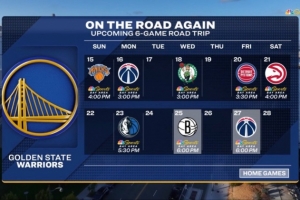 轉播方曬出本場過后勇士的賽程,他們將開啟六連客,對手分別為尼克斯、奇才、凱爾特人、活塞、老鷹和獨行俠。