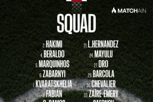 體育資訊4月19日訊 北京時間明天凌晨,巴黎將在法甲第30輪比賽中主場對陣里昂,巴黎公布了此役的球員名單,法比安回歸,努諾·門德斯缺席。
