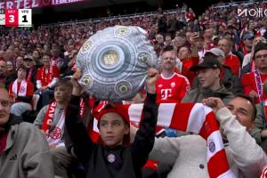 體育資訊04月20日訊 德甲第30輪,拜仁慕尼黑vs斯圖加特。上半場拜仁已取得3-1的領先,距離德甲提前奪冠近在咫尺。看臺上心情愉悅的小球迷高舉沙拉盤抱枕。