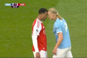 體育資訊04月20日訊 本輪英超焦點戰(zhàn)曼城2-1戰(zhàn)勝阿森納,比賽第83分鐘,哈蘭德和加布里埃爾頂牛導(dǎo)致兩隊球員之間爆發(fā)了沖突,二人各吃一張黃牌。