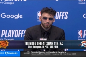 體育資訊4月20日訊 在今天結(jié)束的一場季后賽中,雷霆以119-84戰(zhàn)勝太陽。賽后,雷霆球員切特·霍姆格倫出席了新聞發(fā)布會。以下是完整版采訪內(nèi)容。
