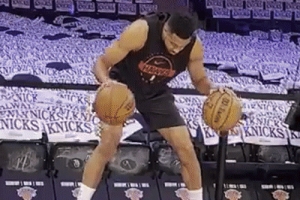 體育資訊4月23日訊 近日,老鷹球員CJ·麥科勒姆賽前在場邊練習控運。