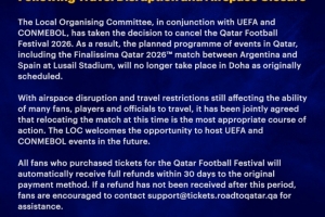 當地時間3月16日,當地組織委員會與歐足聯和南美足聯協商后,決定取消2026年卡塔爾足球節。因此,原定在卡塔爾舉行的一系列活動,包括在盧塞爾體育場進行的阿根廷對陣西班牙的2026年卡塔爾歐美杯比賽,將不再按原計劃在多哈舉行。