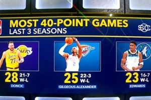 近3季40+排名:東契奇28場(chǎng)(21勝7負(fù))、亞歷山大25場(chǎng)(22勝3負(fù))、華子23場(chǎng)(16勝7負(fù))