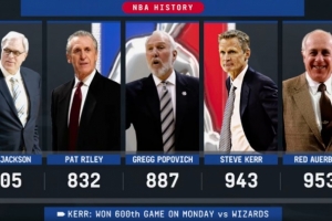 (神算子帕特·萊利832場第2少,波波維奇887場第3少,紅衣主教奧爾巴赫953場排在第5)