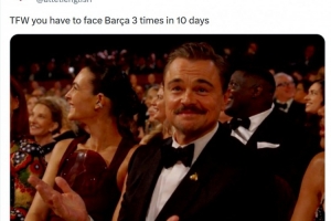 這意味著馬競(jìng)將在10天內(nèi)3次對(duì)陣巴薩,馬競(jìng)官方社媒曬出萊昂納多·迪卡普里奧在奧斯卡頒獎(jiǎng)典禮上一臉無奈的照片,配文:“當(dāng)你不得不在10天內(nèi)3次對(duì)陣巴薩時(shí)的感受?!?/p>