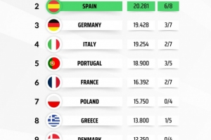 體育資訊3月20日訊 歐戰1/8決賽戰罷,媒體列出了本賽季各聯賽歐戰積分排名,英超24.791分居首,只需要一場平局就能鎖定額外歐冠席位,西甲20.281分次席,6支球隊晉級歐戰8強形勢大好。