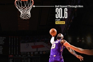 根據統(tǒng)計,詹姆斯的這記勢大力沉的扣籃起跳距離為3.2米,籃球穿越籃筐的速度為49.2公里/小時。