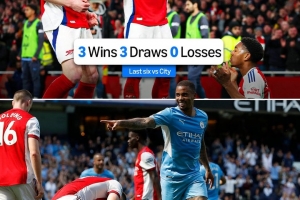 在過去6次對(duì)陣曼城的比賽中,阿森納取得3勝3平保持不敗,值得一提的是,在這6場(chǎng)比賽之前的16場(chǎng)比賽中,阿森納對(duì)陣曼城僅取得1勝15負(fù)的糟糕戰(zhàn)績(jī)。